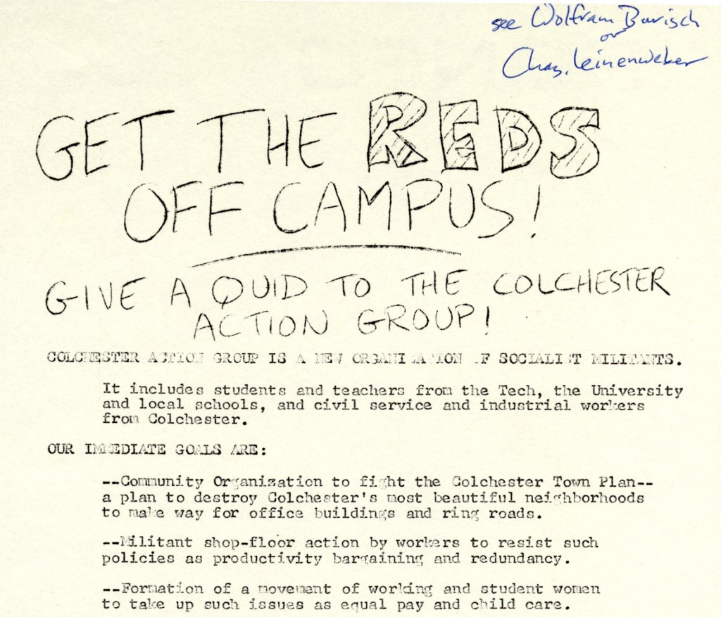 - ‘The Witch Trials Continue – at Essex – the “Liberal” University’ (Spring 1970). Student Action Committee bulletin recalling Spring 1968 and adding notes on Bowden’s exclusion of three students, followed by charges against 30 for participating in an occupation of the Vice Chancellor’s offices 04-05.03.70.